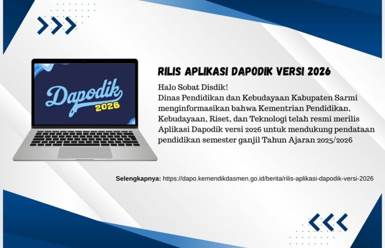 Dinas Pendidikan dan Kebudayaan Kabupaten Sarmi mengimbau seluruh satuan pendidikan untuk memprioritaskan pendataan siswa naik kelas dan siswa baru, serta memastikan seluruh data telah dimutakhirkan sebelum 31 Agustus 2025, sesuai dengan Permendikdasmen No. 8 Tahun 2025. Mari bersama kita sukseskan pemutakhiran data Dapodik versi 2026 demi terwujudnya Satu Data Pendidikan Indonesia!
